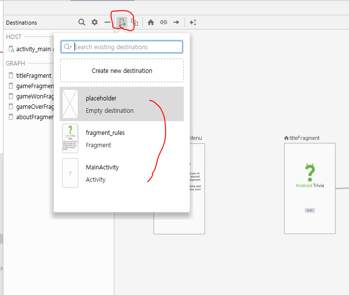6) 디자인 탭 상단에 + 모양 클릭 후, 네비게이션에 사용할 화면 추가.