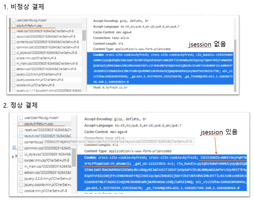 2) 결제 게이트웨이 페이지를 통해서 hyfresh 사이트로 접속 시, JSESSIONID이 사라지는 현상 발생.