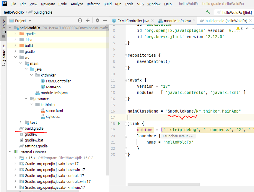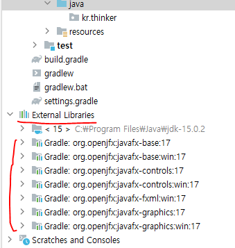 빌드가 완료되면 External Libraries에 javafx 17 라이브러리가 받아졌는 것을 확인할 수 있다.