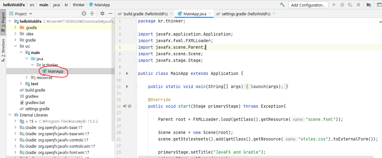 11. resources 밑에 kr > thinker 폴더 아래에 scene.fxml과 styles.css 파일을 만들고 코드를 입력한다.