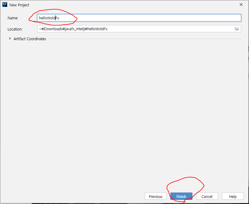 5. 프로젝트 이름을 helloWoldFx으로 입력 후, Finish 버튼을 누른다.