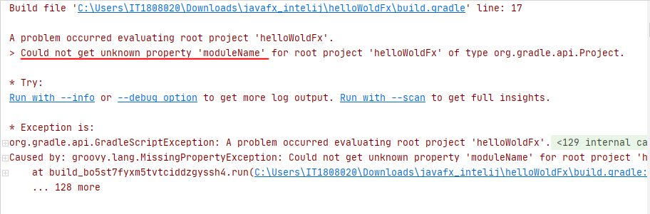 > Could not get unknown property 'moduleName' for root project 'helloWoldFx' of type org.gradle.api.Project.