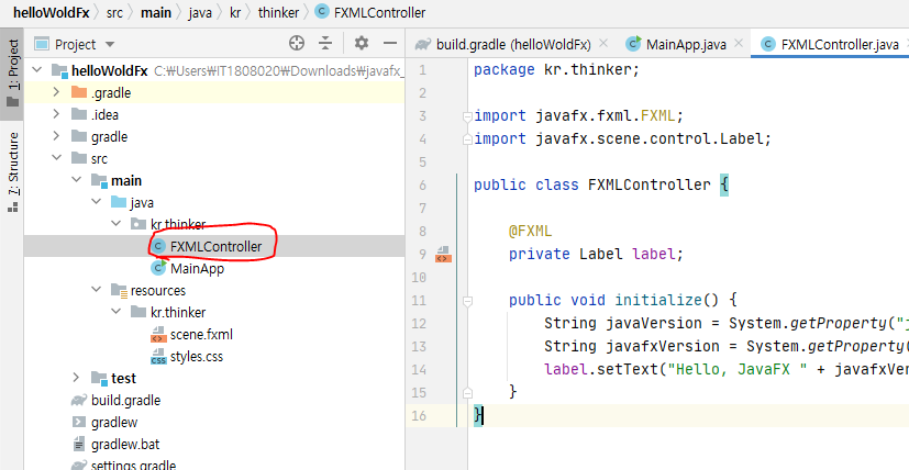 12. kr.thinker 패키지 아래에 FXMLController.java 클래스를 만들고 코드를 입력한다.