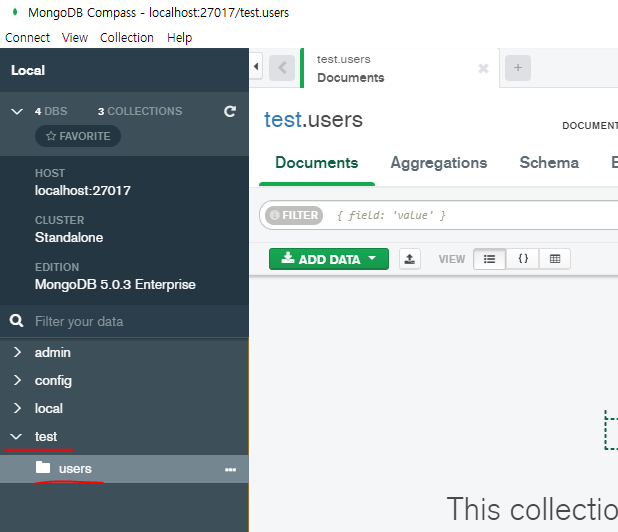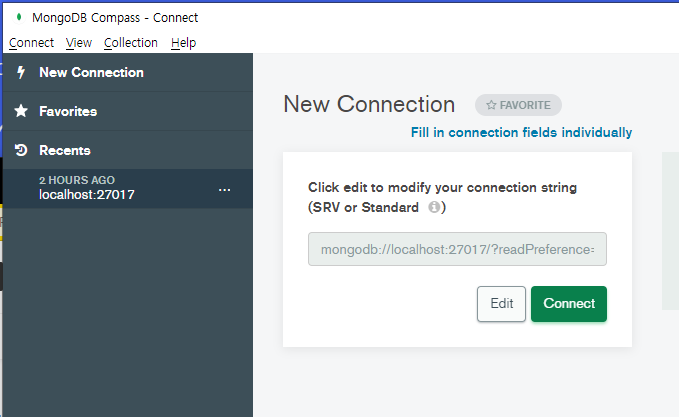 설치 후, MongoDB Compass Tool이 설치되는데, 정상적으로 Connection이 이루어지면 설치가 된 것이다.