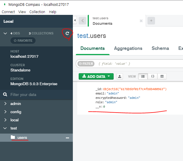 12. Adminbro 페이지에서 User -> Create new -> 아래 그림과 같이 입력 후, Save를 누른다. 그러면 MongoDB에 데이터가 삽입되어 있는 것을 볼 수 있다.