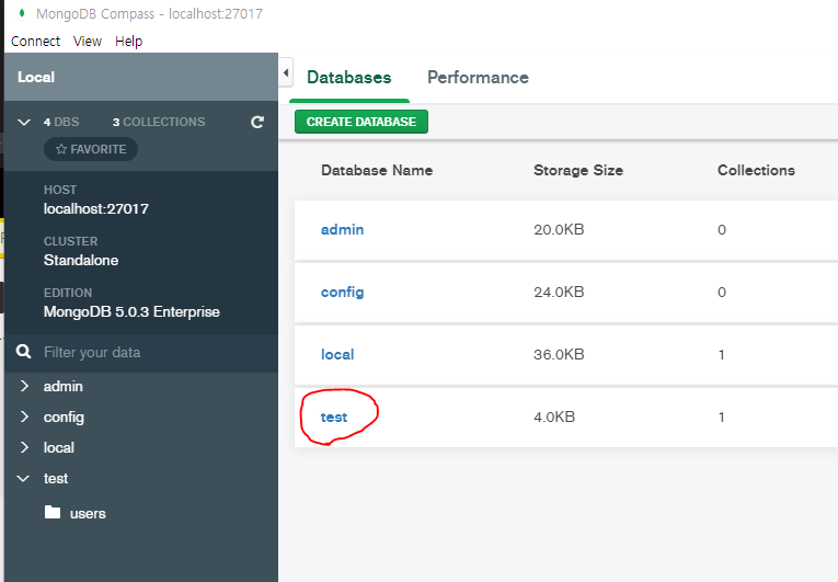 1) 아래 코드는 test 이름으로 database가 생성된다.