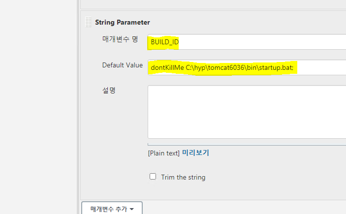 1) 젠킨스가 스크립트 실행 후, 내부에서 실행된 톰캣이 자꾸 종료되었다. 실제로 스크립트 종료 후, 내부에서 실행된 프로세스를 제거한다고 한다. 그래서 String parameter으로 BUILD_ID를 추가하여, 톰캣 프로세스가 종료되지 않도록했다.